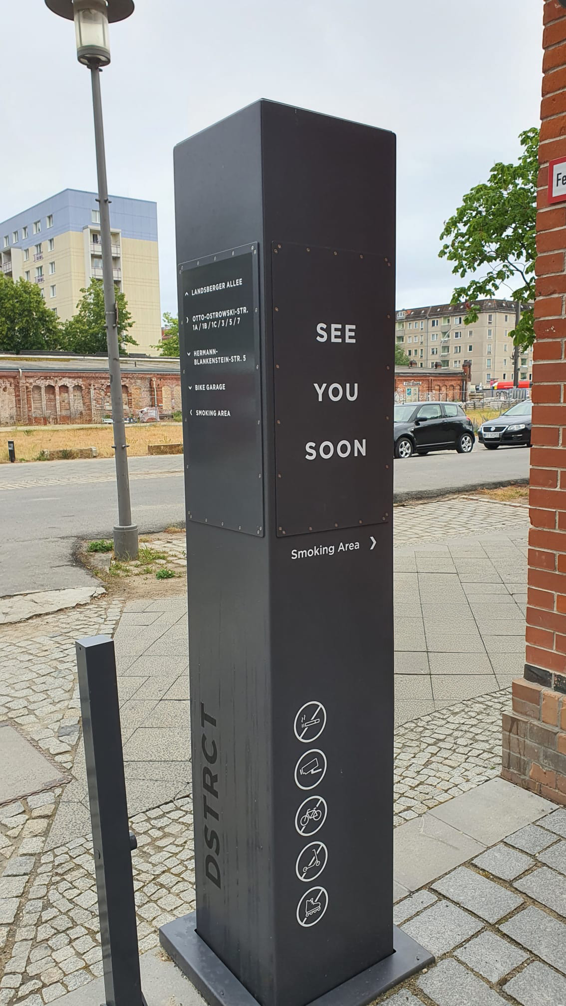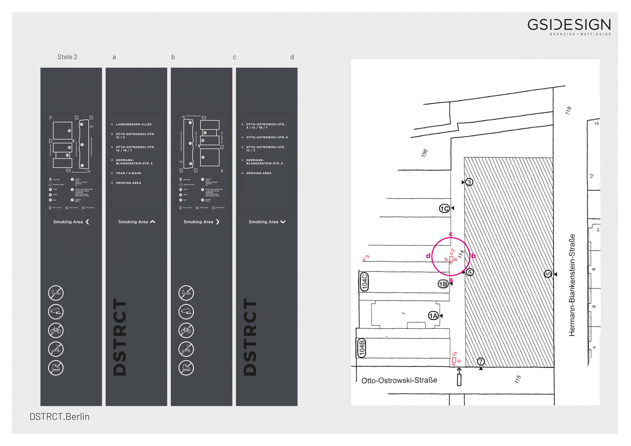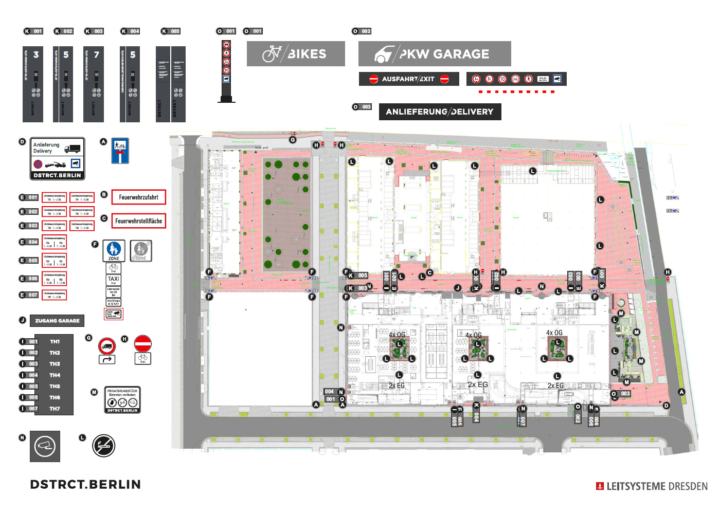 Im Außengelände von DSTRCT.Berlin gewährleisten übersichtliche Wegweiser, gut platzierte Lagepläne und harmonisch in die Architektur integrierte Beschilderungen eine schnelle Orientierung für Besucher, Mitarbeitende und Lieferanten. Neben der allgemeinen Wegeführung haben wir auch Sicherheitsbeschilderungen nach Brandschutzvorgaben sowie verkehrsrechtliche Beschilderungen gemäß StVO in der Ausführung geplant und installiert. So ist nicht nur eine reibungslose Orientierung, sondern auch die Sicherheit aller Nutzer des Geländes gewährleistet.