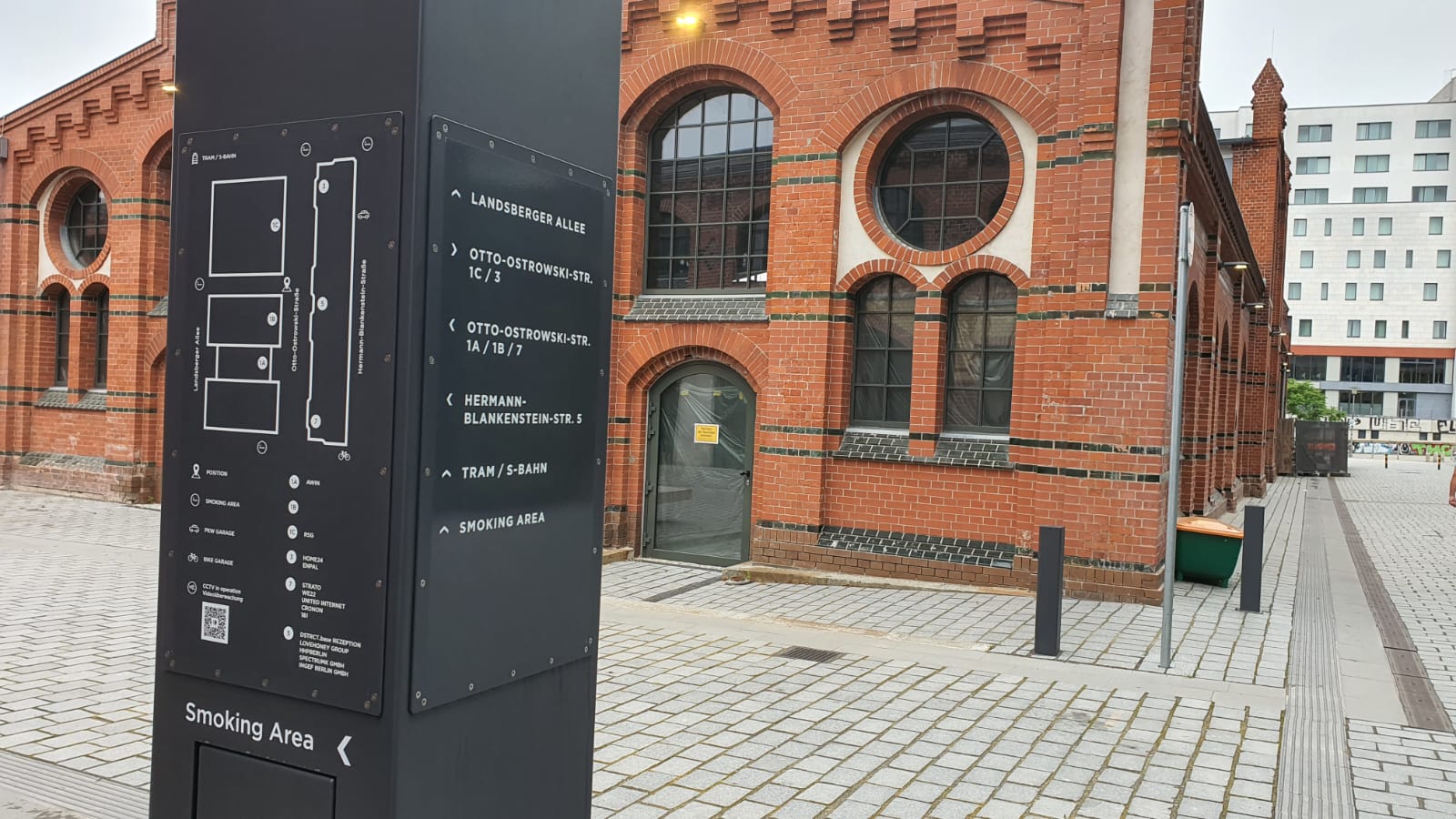 Der Bürokomplex DSTRCT.Berlin kombiniert moderne Architektur mit sorgfältig restaurierten historischen Hallen. Unser Team hat hier ein maßgeschneidertes Leit- und Orientierungssystem umgesetzt, das nicht nur im Inneren, sondern auch im Außenbereich für klare und effiziente Wegeführung sorgt.